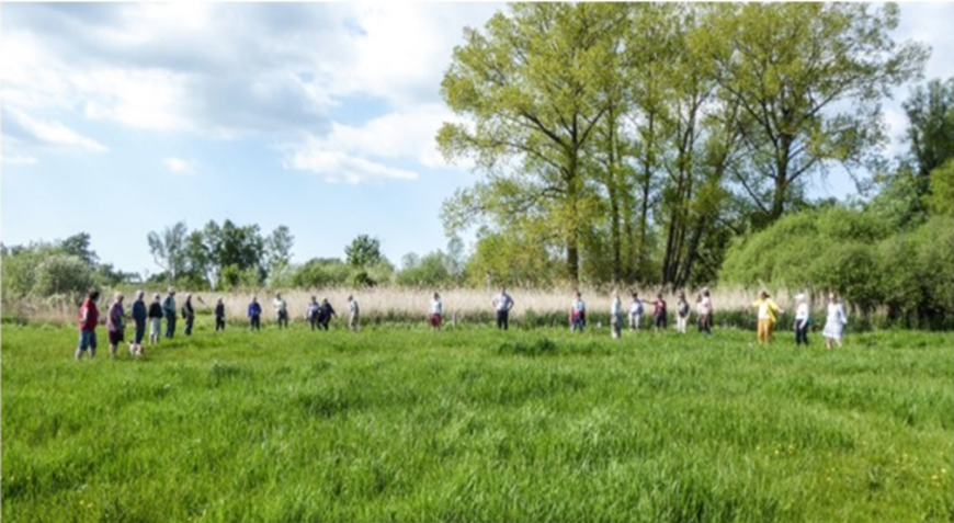Vejen vil krydse Værebro Å, der ligger for enden af engen på billedet. Gruppen af mennesker visualiserer bredden af selve motorvejen.