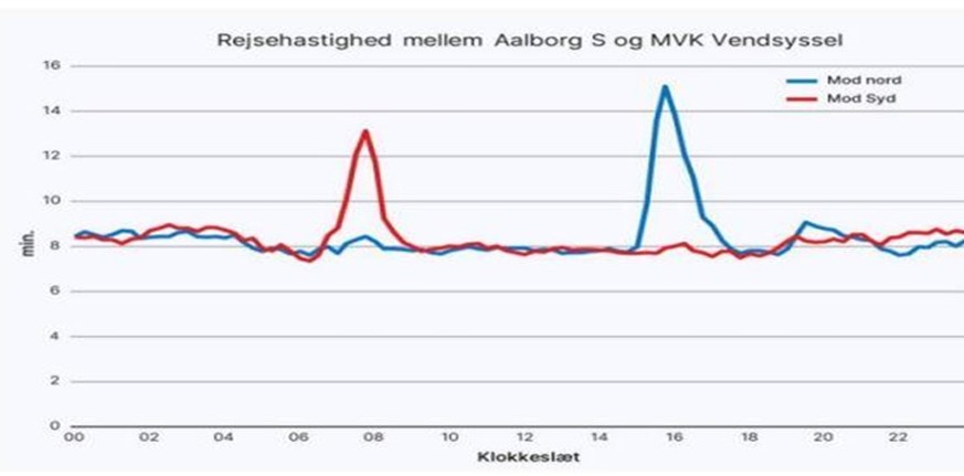 Her kan man f.eks. se de korte tidsrum, hvor der må lettes lidt på speederen, gennem Aalborg: