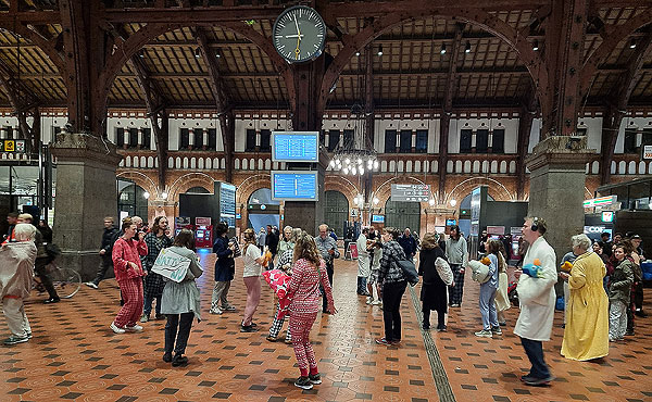 Vi byder politikere op til dans for nattog fredag aften d. 12.12. kl. 19. På dette tidspunkt bliver fliserne midt i hallen på Københavns Hovedbanegård omdannet til dansegulv for en tavs, men intens disco-manifestation. De dansende vil være i nattøj med hovedpuder og bamser, og der vil være unge såvel som ældre, som medvirker. Det er et Pyjama Party, som finder sted samtidig på mere end 14 europæiske banegårde.